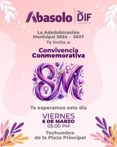 El Republicano Ayuntamiento de Abasolo extiende una cordial invitación a todas las mujeres de nuestro municipio para participar en la Convivencia Conmemorativa con motivo del Día Internacional de la Mujer. Este evento tiene como propósito fundamental reconocer el papel trascendental que desempeñan las mujeres en nuestra sociedad, ofreciendo un espacio de encuentro y sano esparcimiento que fortalezca el tejido social